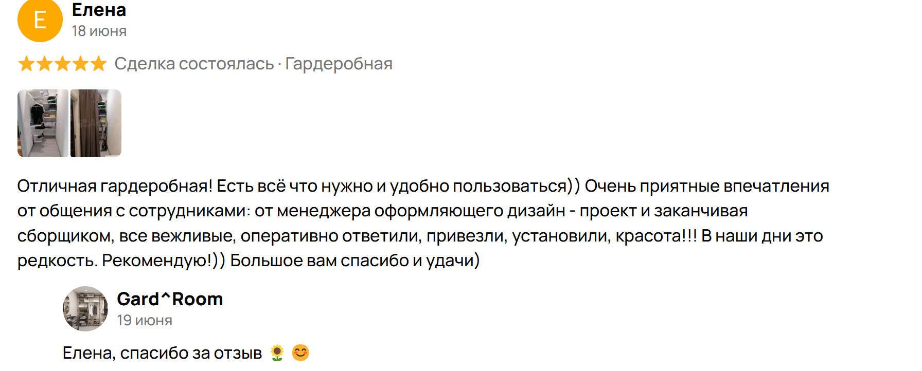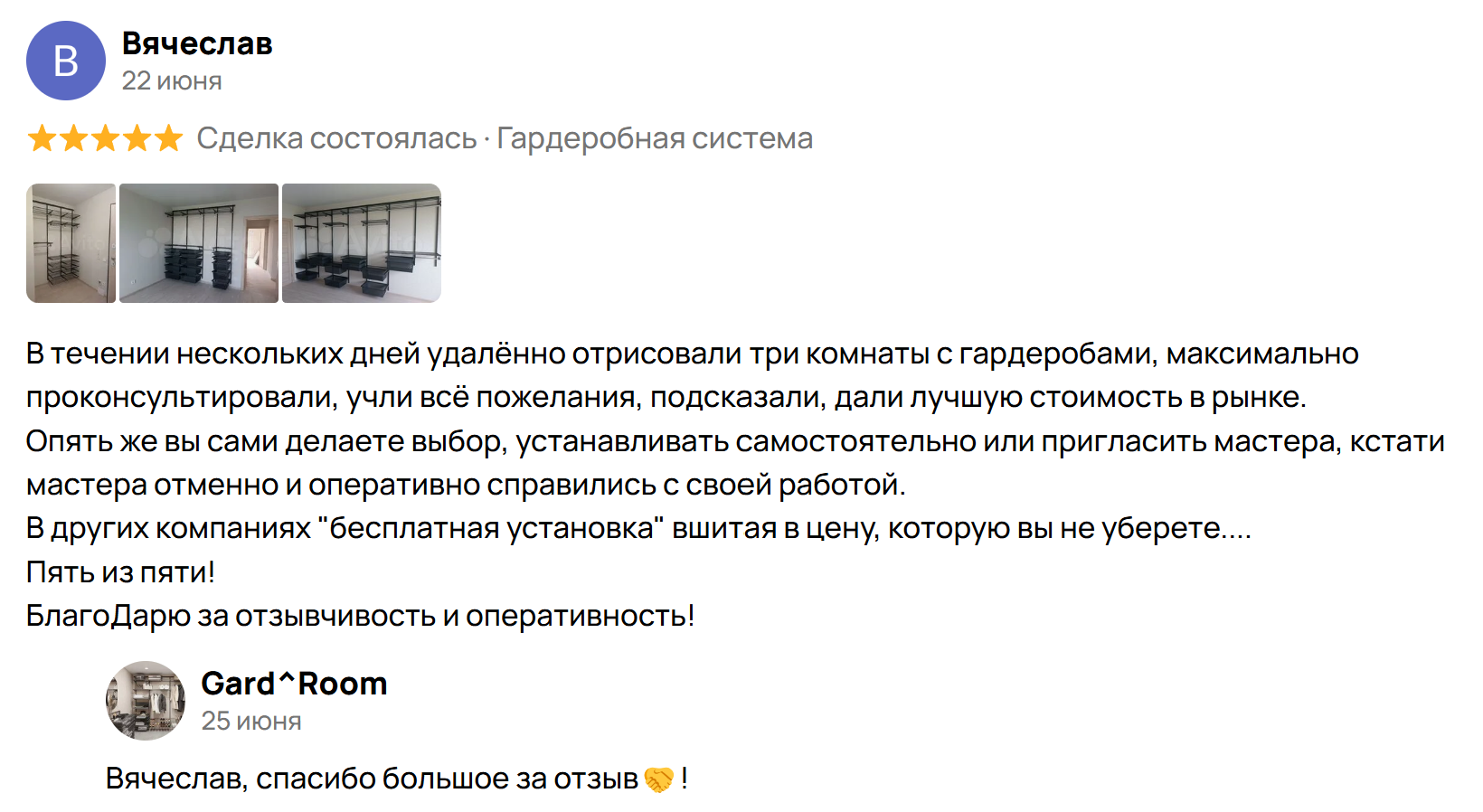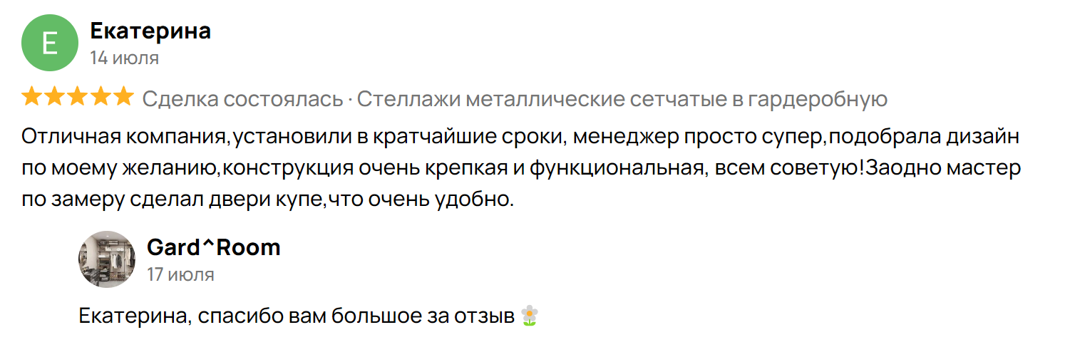 Благодарю компанию Gard Room, в частности, Анну. Сделали две гардеробные комнаты по нашему запросу. Все очень быстро. Слаженная работа. Желаю Вам успехов и процветания!!